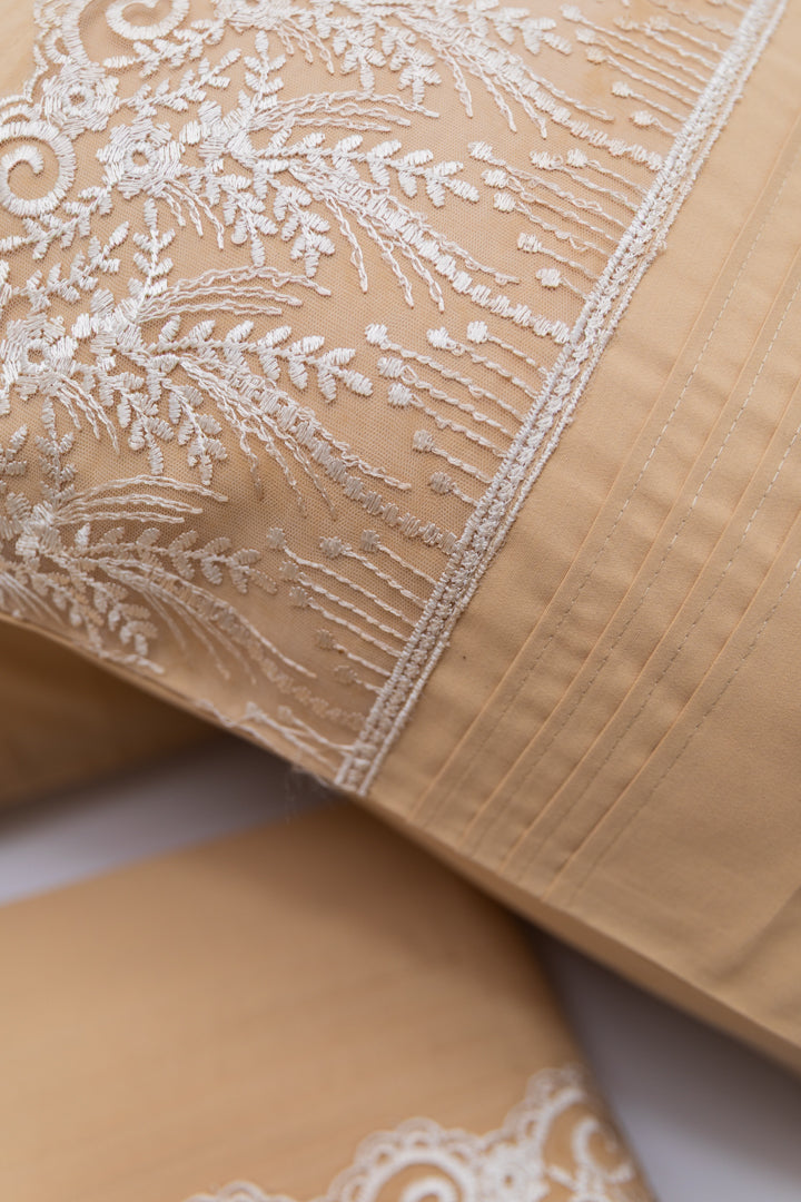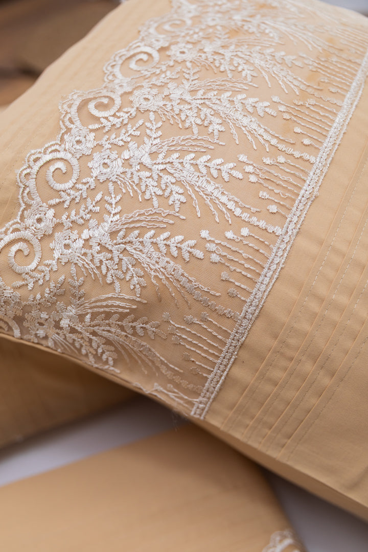 A flat cotton bedsheet set adorned with luxurious guipure lace for an elegant and refined bedroom look. Crafted from high-quality soft cotton that ensures lasting comfort and breathability, with delicate lace detailing that adds a timeless touch of sophistication.