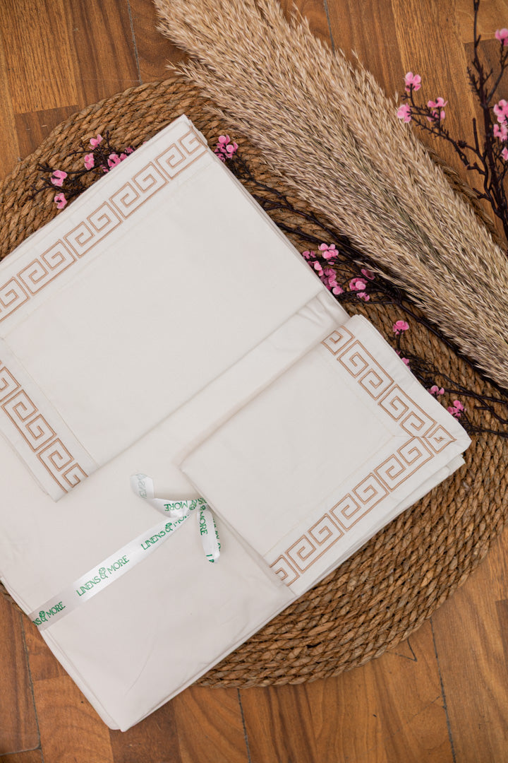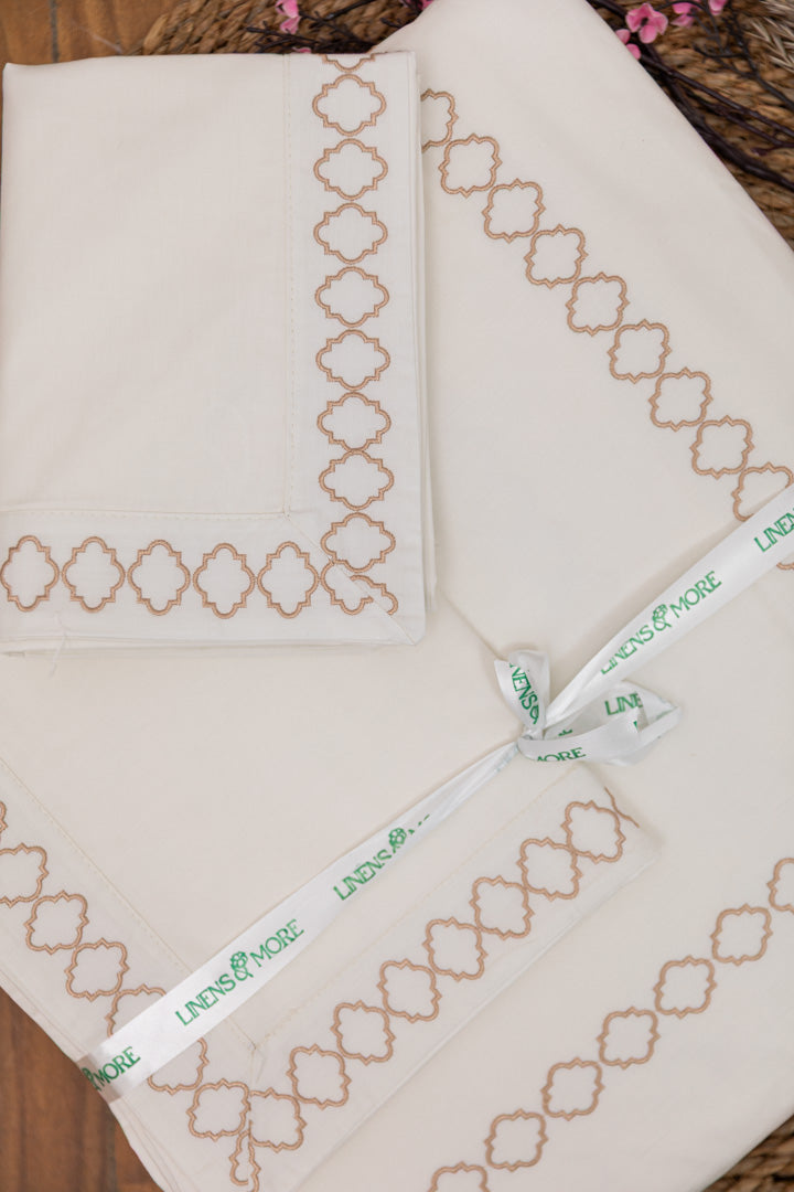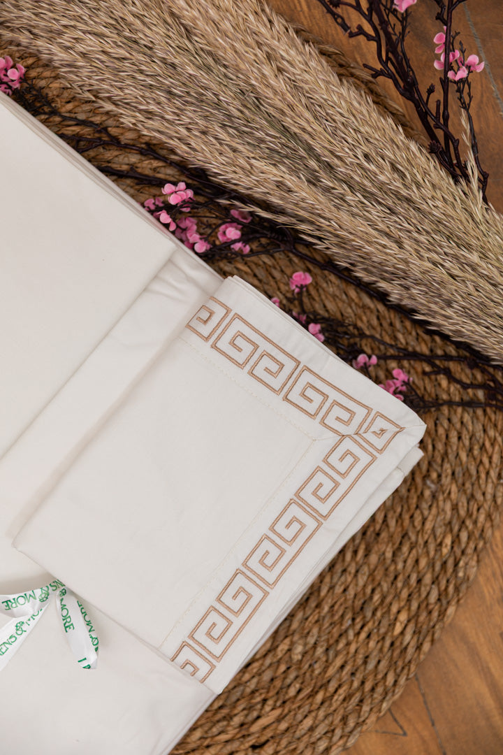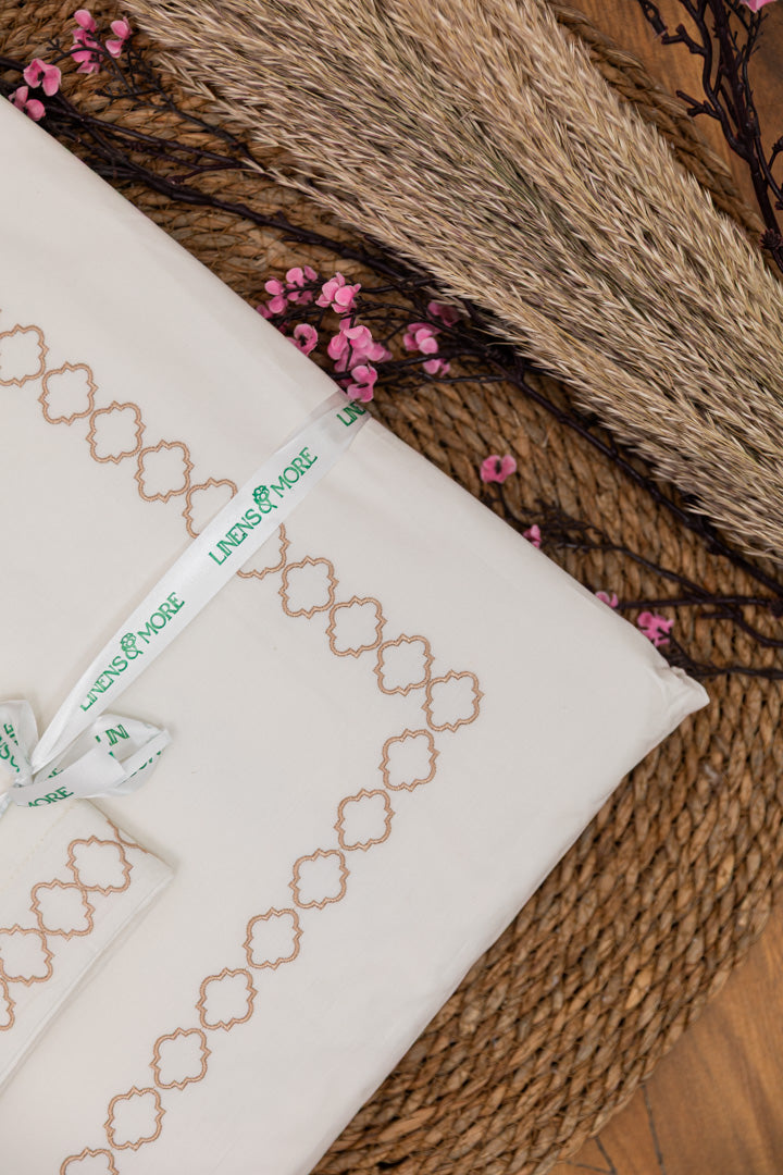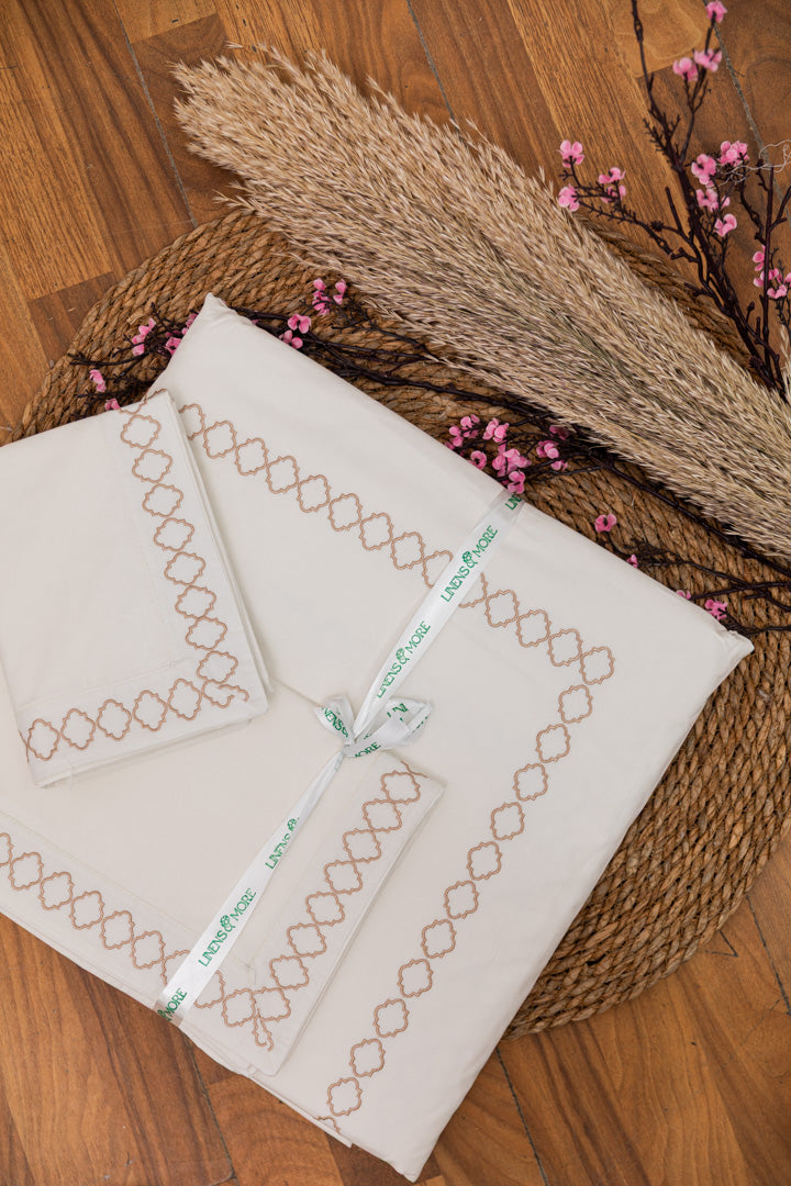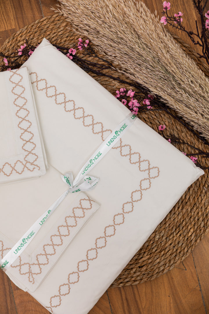 A luxurious duvet cover made from soft percale cotton, featuring an elegant design adorned with refined silk thread embroidery for a touch of sophistication and elegance. It helps protect the original duvet from dust and wear, preserving its quality and appearance for a long time. With its durable fabric and colorfast properties, it is a perfect addition for those seeking both comfort and style in their bedroom.