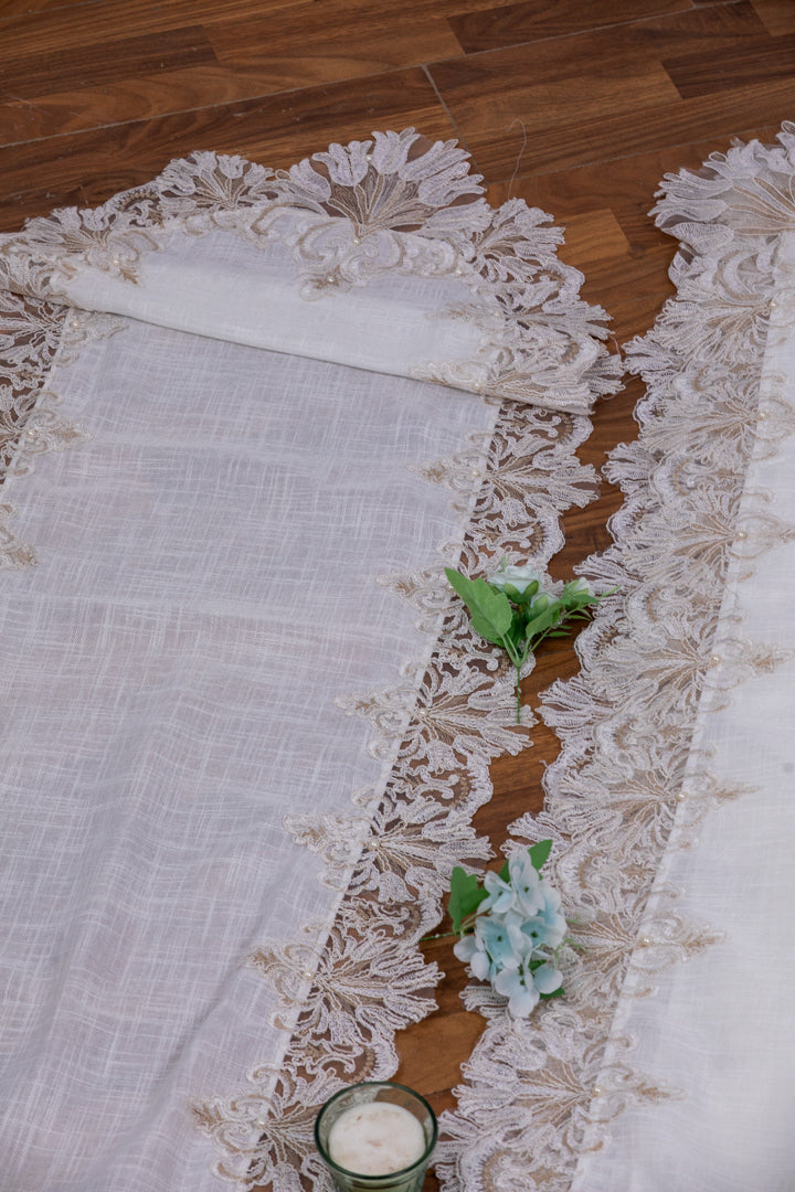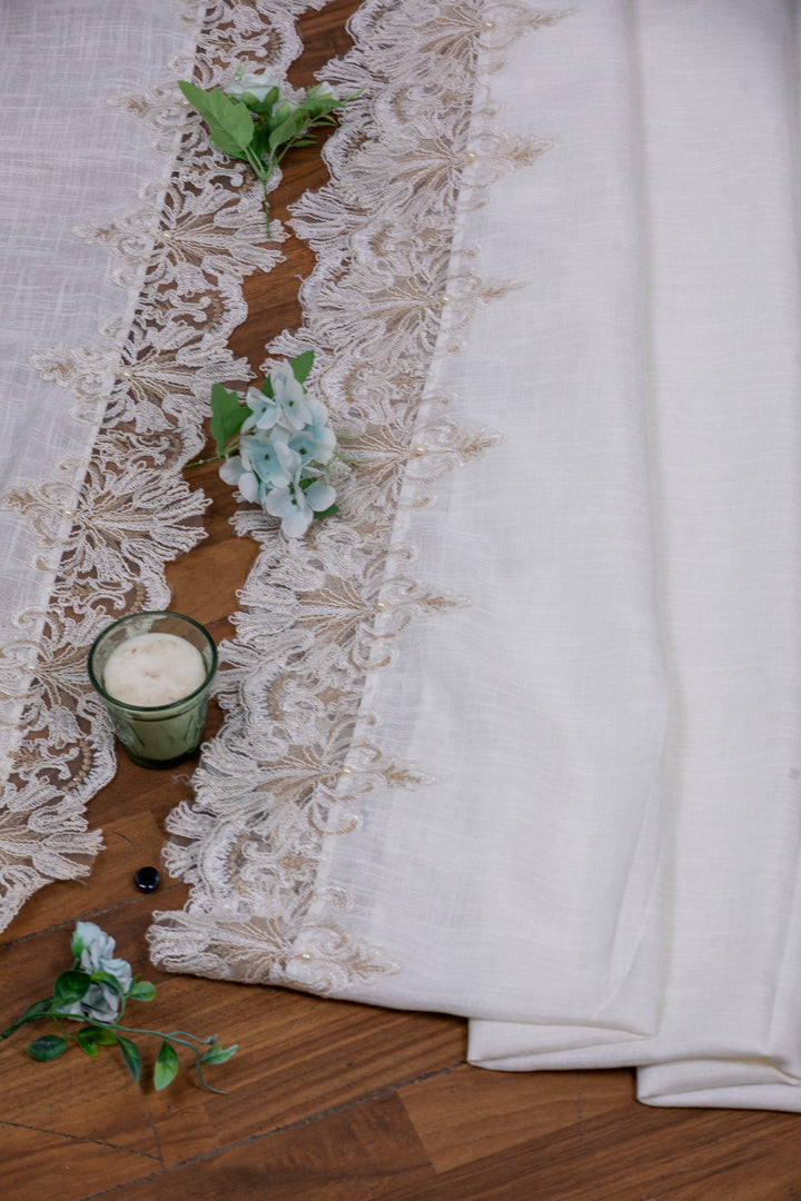 مصنوع من قماش كتان فاخر بتفاصيل دانتيل فخمة.