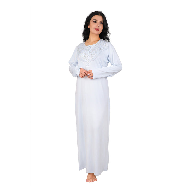 Elegant Details: The nightgown features a decorative embroidered or beaded trim around the neckline, adding a touch of sophistication and charm.