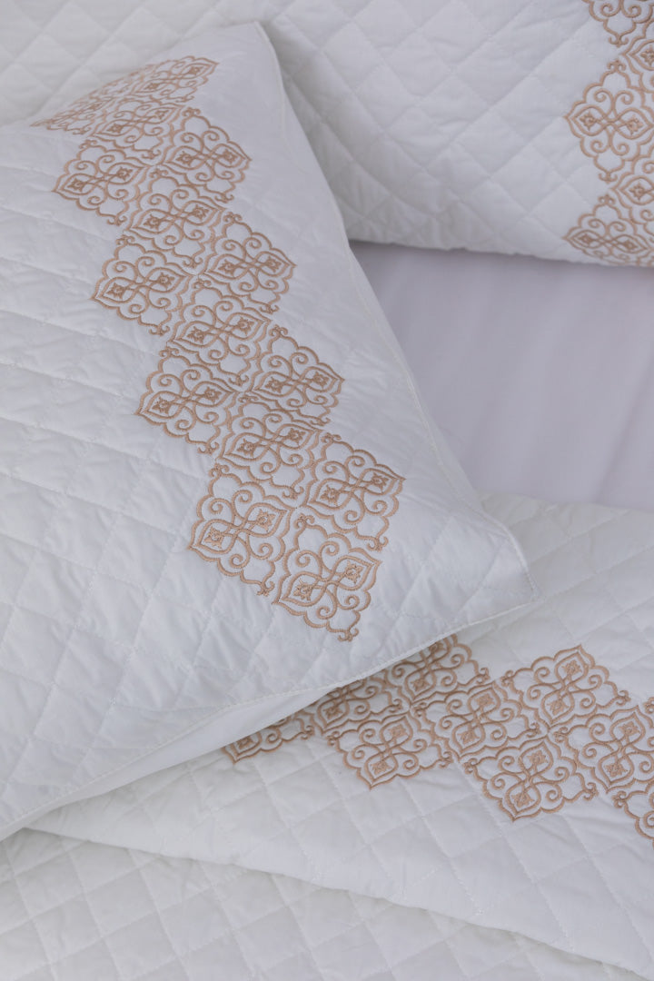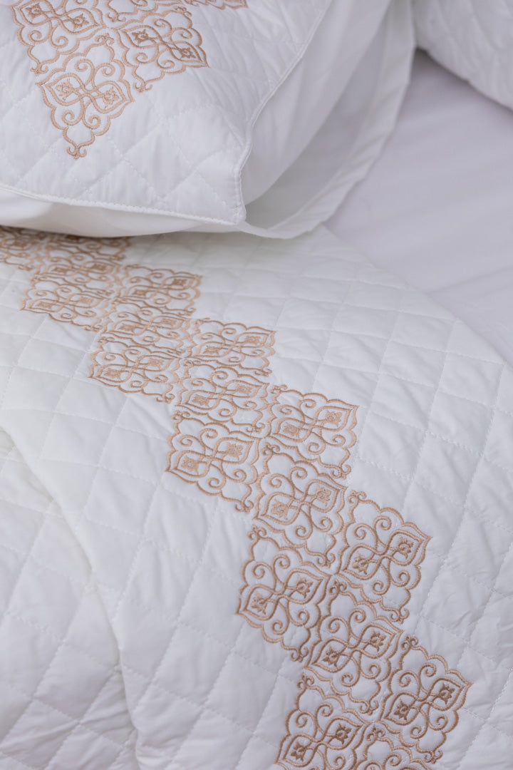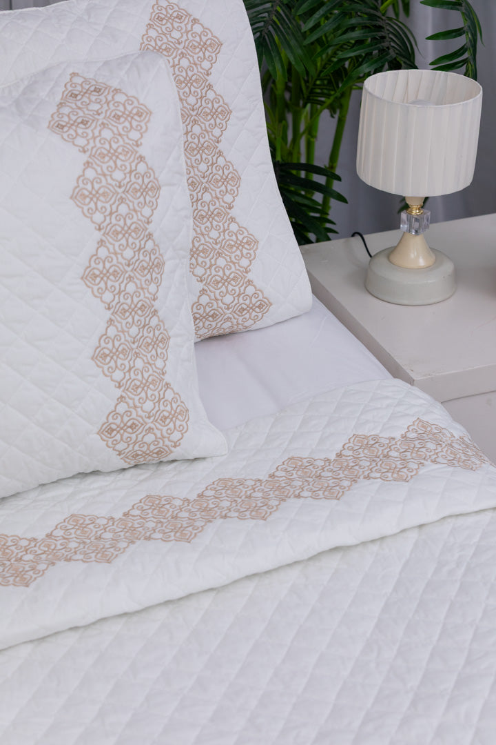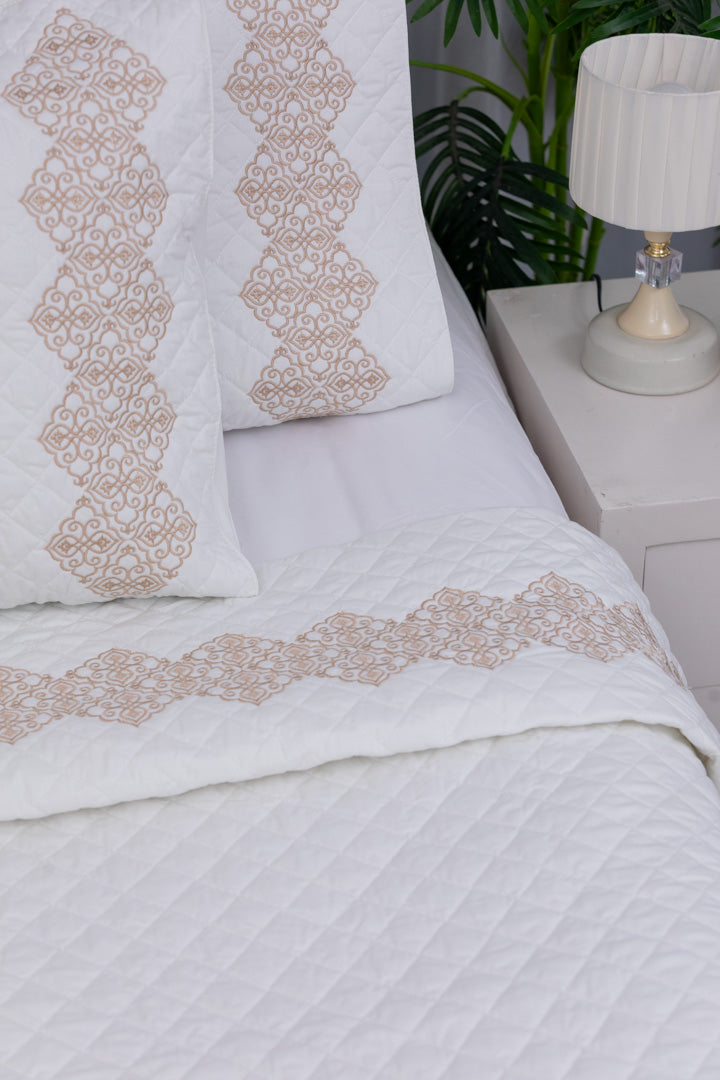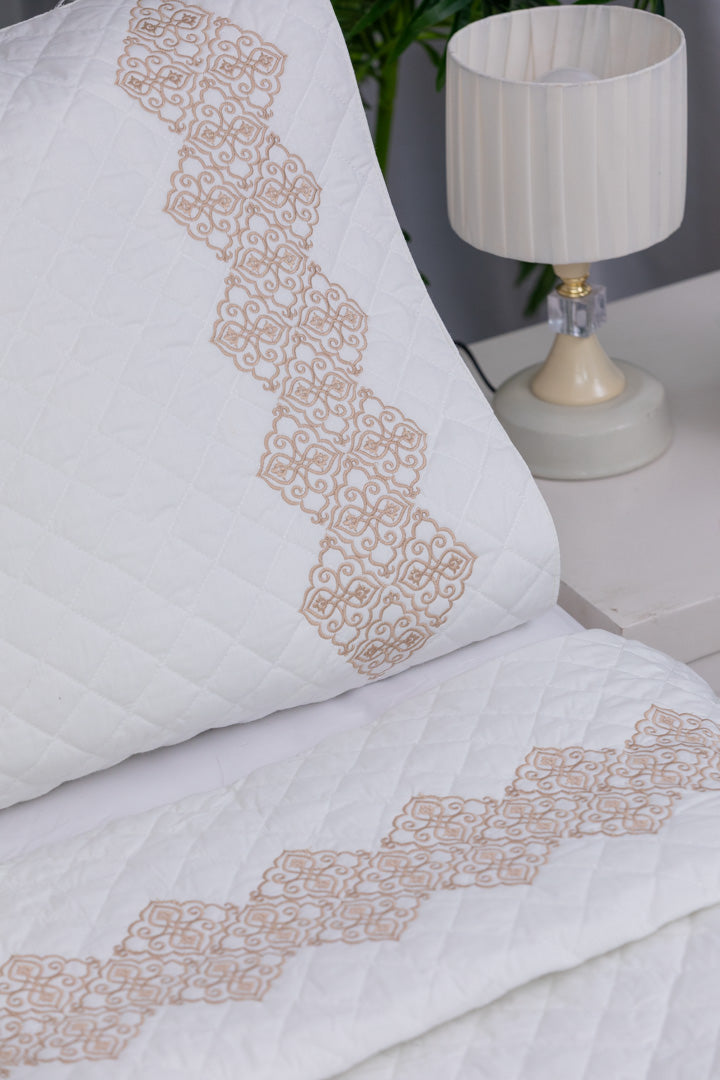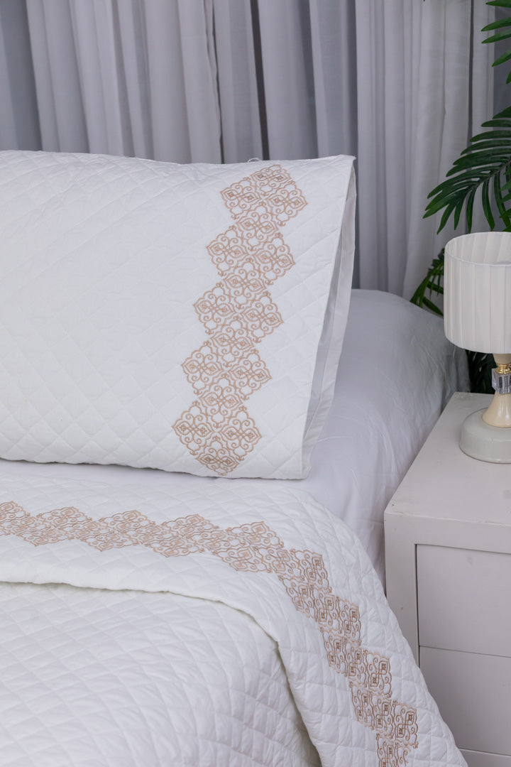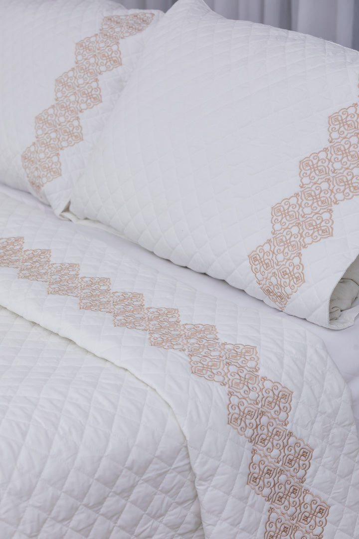 diamond Capitonné Coverlet is a true embodiment of royal luxury and refined sophistication, thoughtfully designed to bring a timeless touch of elegance to your bedroom. Made from high-quality percale cotton, it features a soft, breathable, and lightweight fabric that ensures exceptional comfort and a soothing feel throughout the night. The elegant capitonné stitching, paired with intricate silk thread embroidery, adds an artistic and luxurious dimension to its design. Built to last, it resists pilling and maintains its smooth texture and rich appearance even after multiple washes. With colorfast properties and easy-care fabric, it stays vibrant and fresh like new.