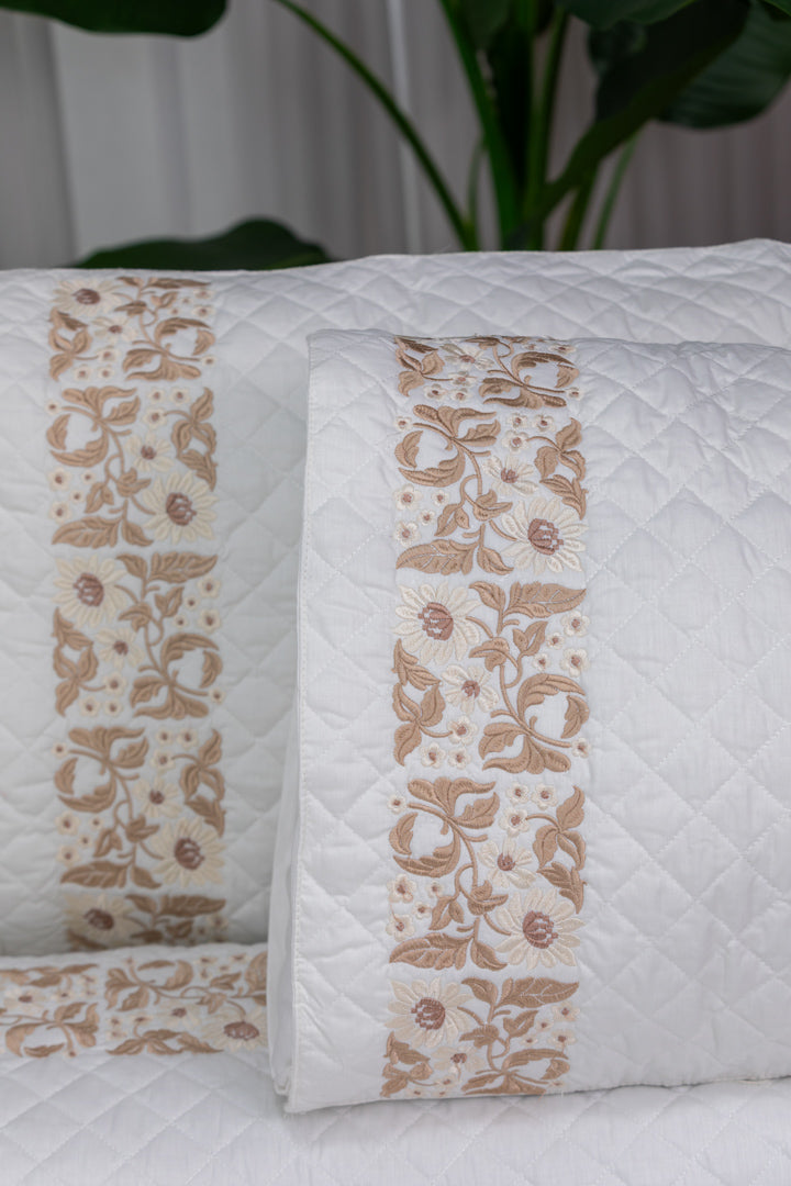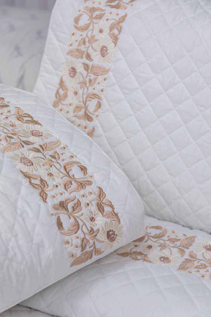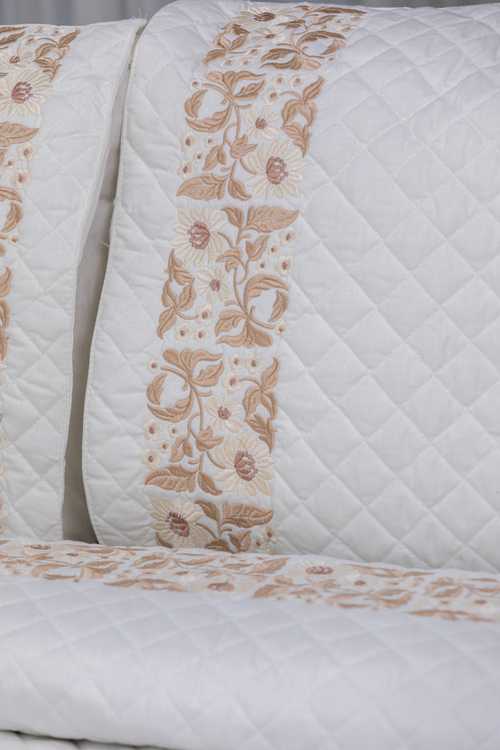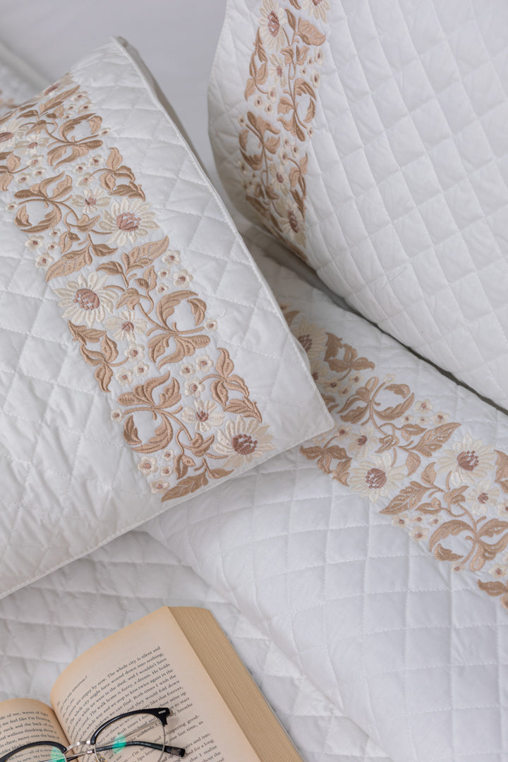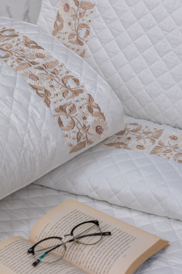 The Flourish Capitonné Coverlet is a true embodiment of royal luxury and refined sophistication, thoughtfully designed to bring a timeless touch of elegance to your bedroom. Made from high-quality percale cotton, it features a soft, breathable, and lightweight fabric that ensures exceptional comfort and a soothing feel throughout the night. The elegant capitonné stitching, paired with intricate silk thread embroidery, adds an artistic and luxurious dimension to its design. Built to last, it resists pilling and maintains its smooth texture and rich appearance even after multiple washes. With colorfast properties and easy-care fabric, it stays vibrant and fresh like new.