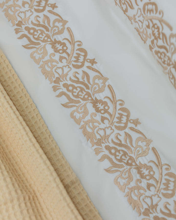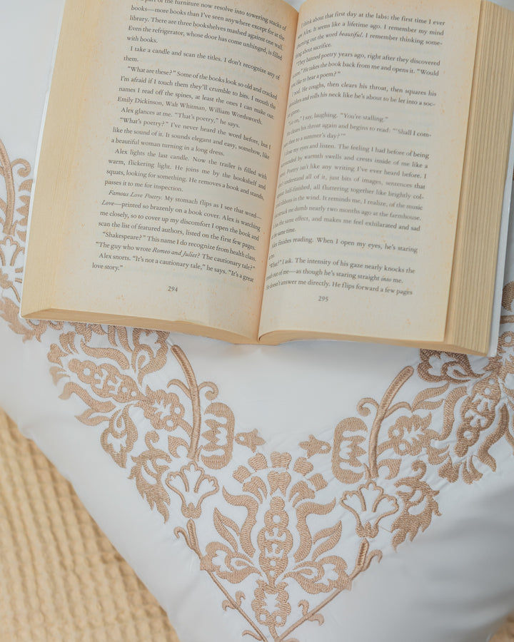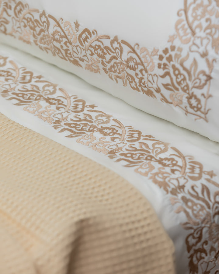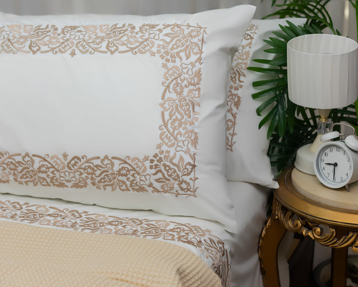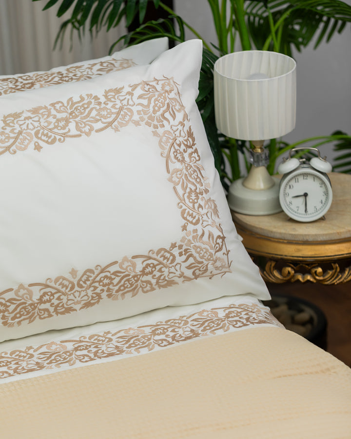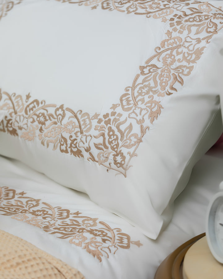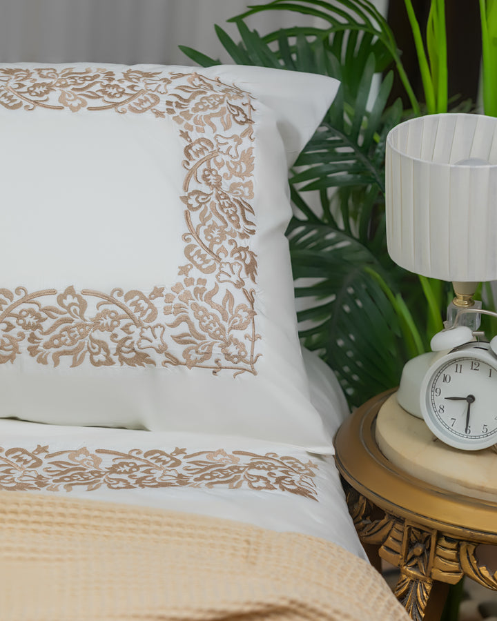 A luxurious bedsheet crafted from high-quality percale cotton, offering an ultra-soft feel and exceptional comfort throughout the night, thanks to its lightweight and breathable fabric. Designed with durable material that resists pilling, ensuring long-lasting smoothness and an elegant appearance even after repeated washing. Adorned with delicate silk thread embroidery, it adds a sophisticated and luxurious touch to your bedroom. With its colorfast properties and easy maintenance, this bedsheet remains vibrant and fresh, making it the perfect choice for those who seek both elegance and durability.