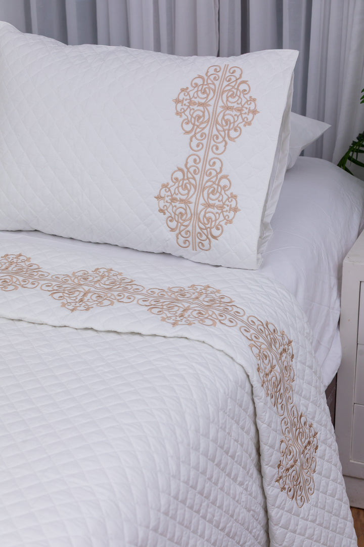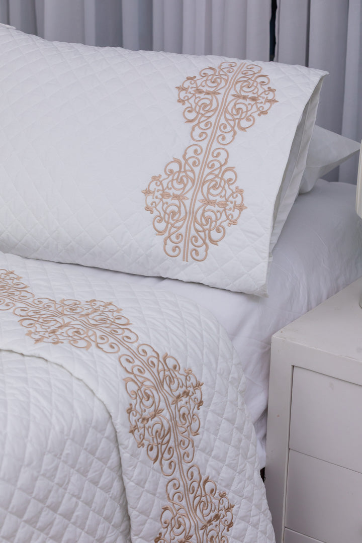 Add timeless sophistication to your bedroom with the Royal Crest Capitonné Coverlet, designed to bring luxury, warmth, and elegance to every detail. Crafted from premium cotton sheet fabric, it provides a soft, breathable texture for year-round comfort. The intricate striped sheet pattern and elegant quilted stitching create a refined look that combines modern design with classic charm. Perfect for enhancing your bedroom décor with a cozy yet polished touch.